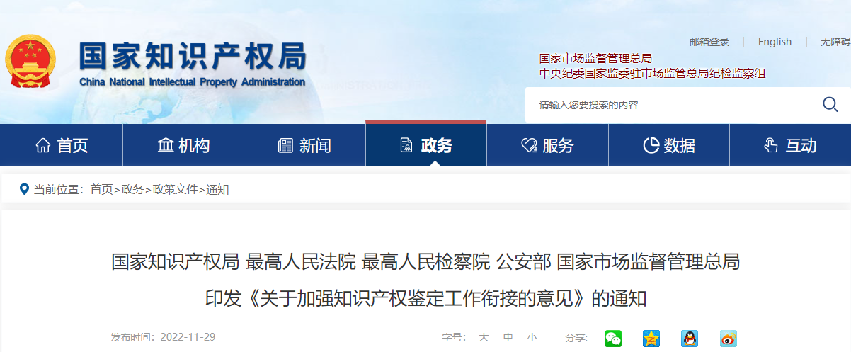 國家知識產(chǎn)權(quán)局 最高人民法院 最高人民檢察院 公安部 國家市場監(jiān)督管理總局印發(fā)《關(guān)于加強知識產(chǎn)權(quán)鑒定工作銜接的意見》的通知