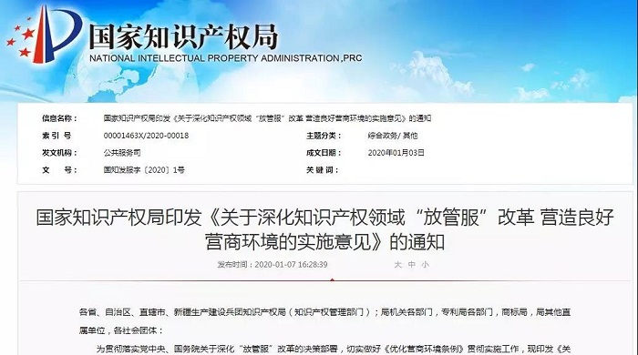 國家知識產(chǎn)權(quán)局印發(fā)《關(guān)于深化知識產(chǎn)權(quán)領(lǐng)域“放管服”改革 營造良好營商環(huán)境的實施意見》的通知