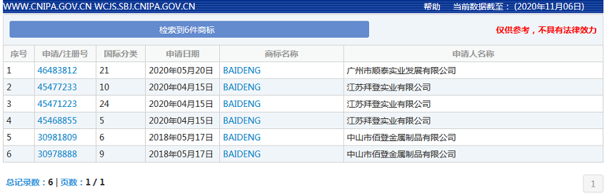 江蘇拜登實業(yè)有限公司申請了6“拜登”及“baideng”商標,其中兩件商標已初審公告,商標核準類別主要為第24類布料床單、第10類醫(yī)療器械等。