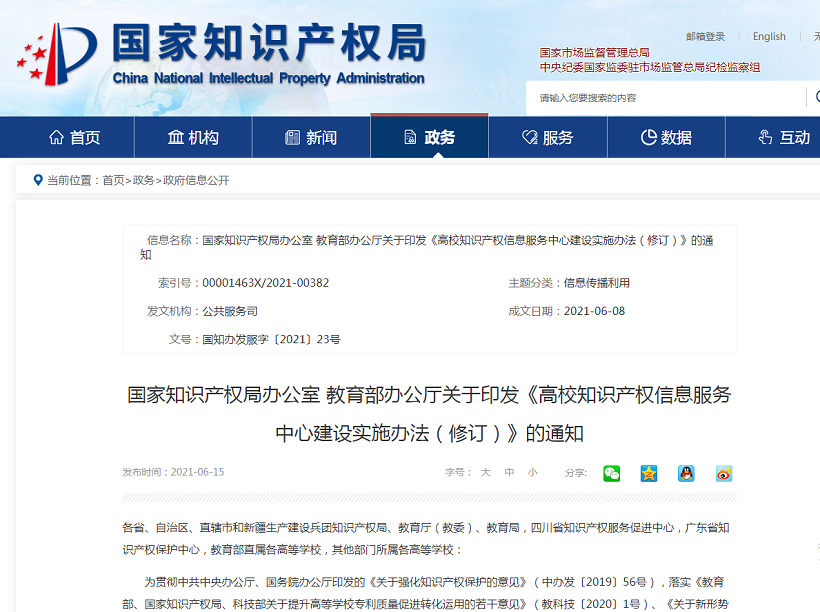 國(guó)家知識(shí)產(chǎn)權(quán)局辦公室 教育部辦公廳關(guān)于印發(fā)《高校知識(shí)產(chǎn)權(quán)信息服務(wù)中心建設(shè)實(shí)施辦法(修訂)》的通知